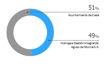 Aguas de Cieza S.A. es una sociedad de economía mixta participada en un 51% de su accionariado por el Ayuntamiento de Cieza, y en un 49% por la mercantil Hidrogea Gestión Integral de Aguas de Murcia S.A.